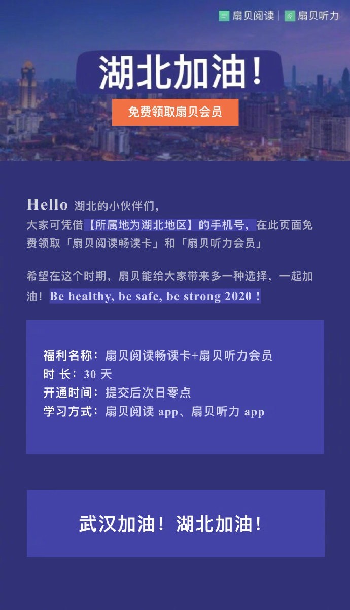 1月28日,扇贝宣布向所有湖北用户免费提供30天「阅读畅读卡」及「听力会员」服务。希望即使不能出门,湖北用户依然可以有更多的选择度过这个特殊时期,在家里即可畅读700+以上英文原版书,畅听12w+原版英文素材。