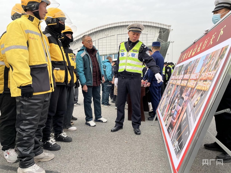 民警向外卖员讲解交通安全知识(央广网发 王哲 摄)