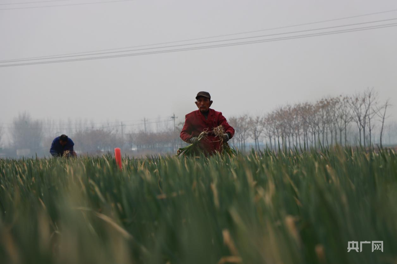 葱农在田间采收大葱(央广网发 王凯 摄)