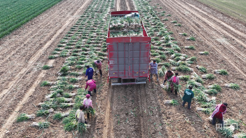 工人对采收的大葱进行装车运输作业(央广网发 王凯 摄)