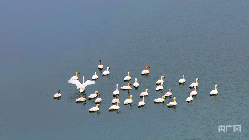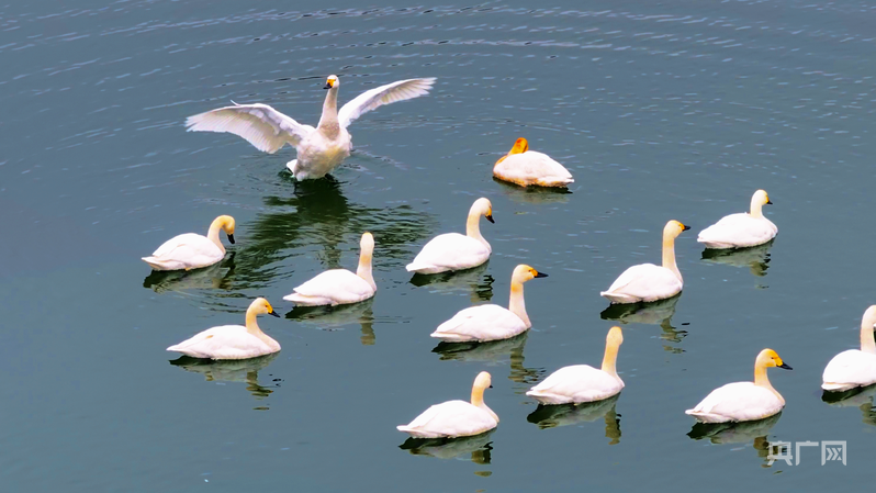 央广网南阳3月2日消息(记者 张丽娜 通讯员 刘剑飞)2月27日,河南省南阳市西峡县鹳河水面波光粼粼,一群优雅的天鹅在水中悠然自得地游弋,它们时而低头觅食,时而振翅高飞,为这宁静的河面增添了几分灵动与生机。