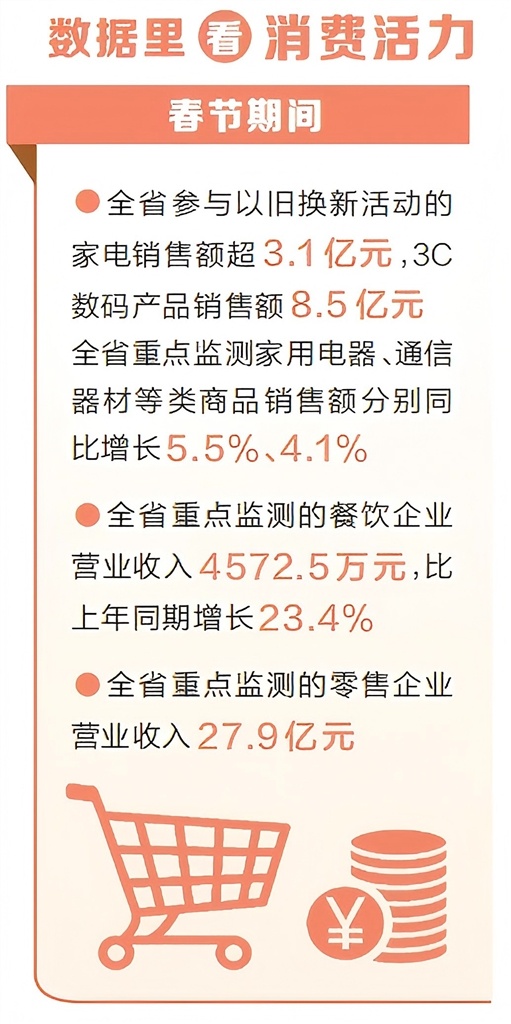 以旧换新带动大宗消费继续向“新”。“给家里两个长辈都换了新手机,这是送给他们的春节礼物。”洛阳市民乔女士说,国补叠加洛阳本地补贴和店内优惠,两部手机便宜了近1000元。抢抓假期换新机遇,洛阳、南阳等地举办汽车联展、家电节等活动,本地补贴、企业让利,带动大宗消费品销售升温。据监测,节日期间全省参与以旧换新活动的家电销售额超3.1亿元,3C数码产品销售额8.5亿元,全省重点监测家用电器、通信器材等类商品销售额分别同比增长5.5%、4.1%。
